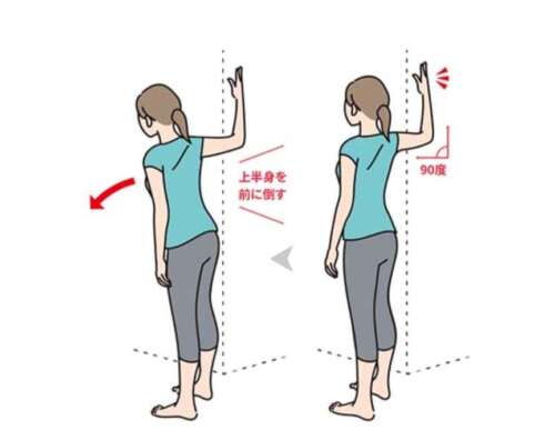★壁のコーナーに真っすぐ立って、片手を壁に当てます。ひじは90度に曲げて肩の高さに合わせる。指先からひじまでが壁にぴったりつくようにします。