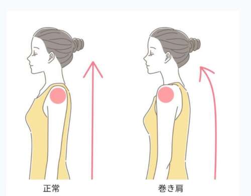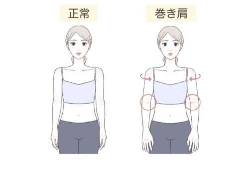 巻き肩(まきがた)は、肩が前方に巻き込むような姿勢のこと。現代のライフスタイルで多く見られる姿勢の問題で、正確な統計はありませんが、専門家の推定では日本人の6~8割に巻き肩の傾向があるとも言われています。