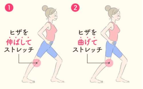 ①足を前後に開き、前の足は軽くひざを曲げます。後ろ足(伸ばす方)のかかとをつけたままひざを伸ばして、ふくらはぎが伸びていることを感じます。これで腓腹筋がストレッチできます。