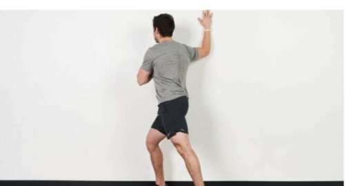 反対の足を少し前に踏み出し、体を捻って大胸筋を伸ばします。
