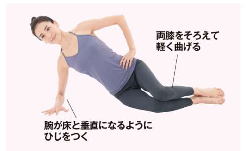 ・右腕が床と垂直になるようにひじをつき、右ひじで支えて上半身を起こします。