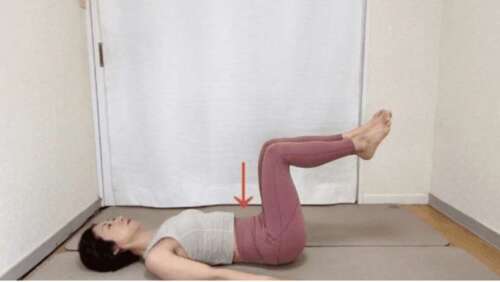 仰向けになり、両膝を90度に曲げて脚を持ち上げる。お腹を軽く引き込み、腰を床に押しつけて浮かないようにする
