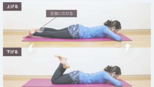 うつ伏せになり 左脚を右脚のかかとに引っ掛ける。