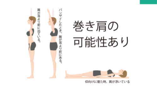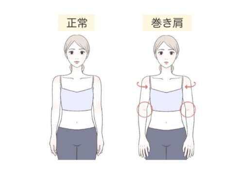 巻き肩になると、肩が正しい位置ではなくなるため、肩周辺の血流が悪くなり、首や肩のこりにつながっていきます。
