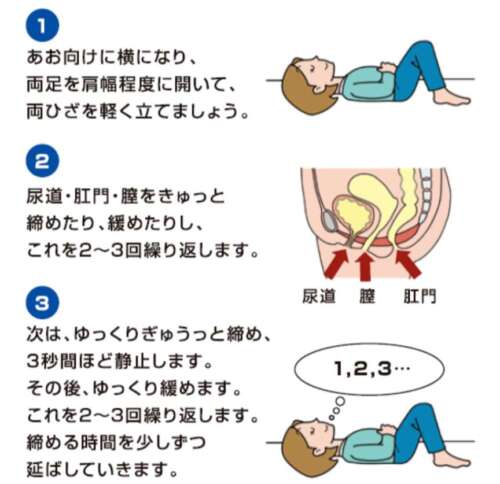 その姿勢のまま5秒程度、肛門、尿道、膣全体を締め、陰部全体をじわじわっと引き上げる感じで締めます。