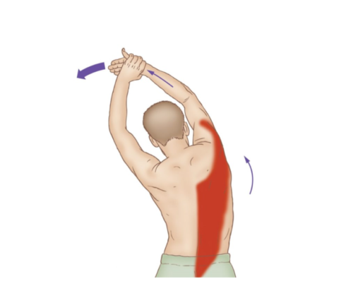 背筋を伸ばし、両手を頭の上に置いて、背筋を伸ばして広背筋のストレッチを開始します。