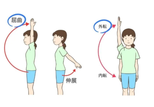 腕を前から上げる。肩関節屈曲という関節運動※イラスト参照