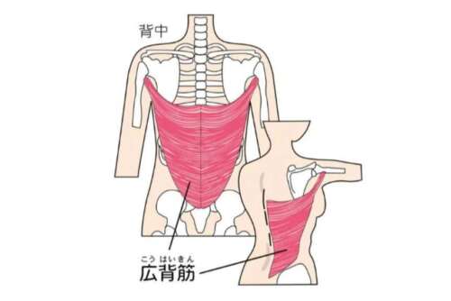 その名の通り広い範囲にわたり背中の下半分を覆う筋肉です。面積としては人の体で1番大きく、背骨や骨盤から上腕にかけて付着しています。