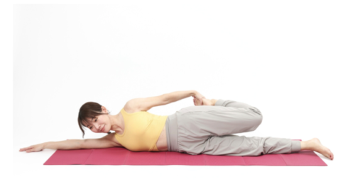 横向きになり、下の脚の膝をお腹に近づけておく。