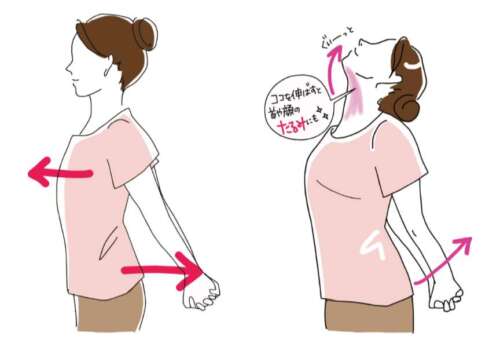 両手を後ろで組み、胸は前に手は後ろに上げ首を後ろにゆっくり反らす。