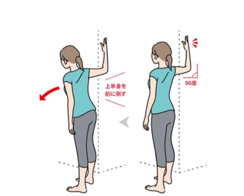 壁のコーナーに真っすぐ立って、片手を壁に当てます。ひじは90度に曲げて肩の高さに合わせる。指先からひじまでが壁にぴったりつくようにします。
