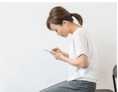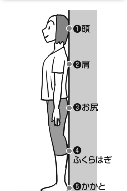 早めに自分の姿勢をチェックして、対策を始めましょう。簡単にできるセルフチェック方法は、まず壁に背中とお尻を付けて、楽に立ちましょう。この姿勢で、頭と肩が壁に付くか、腕の曲がり方はどうかを鏡で見てチェックします。