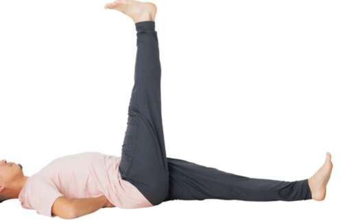 膝を伸ばしたまま片脚を垂直に上げる。腰椎の前弯が保たれていることを確認して行う。反対も。