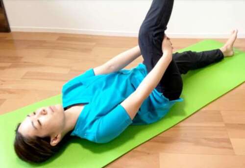 仰向けになり、片方の膝を伸ばし、天井に向かって挙げていきます。