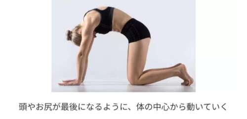 頭やお尻が最後になるように、体の中心から動いていきます。息を吸うときの肩甲骨は、高い位置で寄せると首がすくんでしまうため、首の長さを保てるところで背中の中央に寄せましょう。