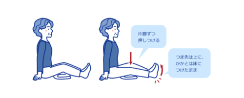 1.床に脚あしを伸ばして座り、ひざの下にタオルを置く。