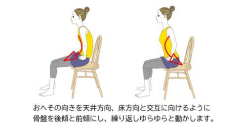 ② おへその向きを天井方向、床方向と交互に向けるように骨盤を後傾と前傾にし、繰り返しゆらゆらと動かします。なるべく頭の位置が前後に動かないように骨盤だけを動かします。