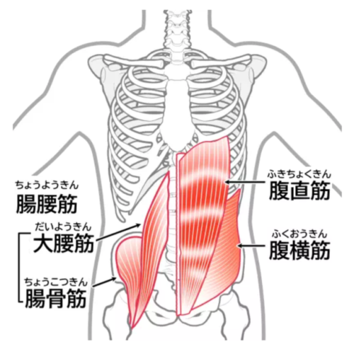 腰痛や姿勢との関係 腹直筋は、腹部前側の中央、肋骨から恥骨にかけて縦長についている、いわゆる「シックスパック」と呼ばれている筋肉です。主に身体を前に丸める動作で働き、正しい姿勢を維持するなどの役割があります。 この腹直筋が衰えると、体幹の安定性が失われ、腰椎に負担がかかりやすくなります。またお腹の筋肉が抜けることで、骨盤の前傾が強くなり、反り腰などの姿勢崩れを引き起こす原因にも繋がります。