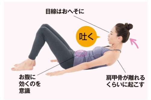 息を吐きながら肩を上げるイメージで3秒かけて体を起こし、目線をおへそに向けて3秒キープ。息を吸いながら3秒かけて1に戻ります。これを5〜10回