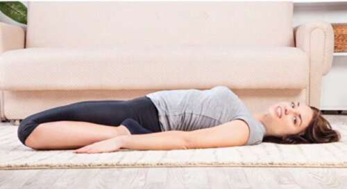仰向けで、左膝を曲げてかかとはお尻の脇へ。ツライ人は、上半身を起こした状態で、手を後ろについて行って。30秒。反対も。