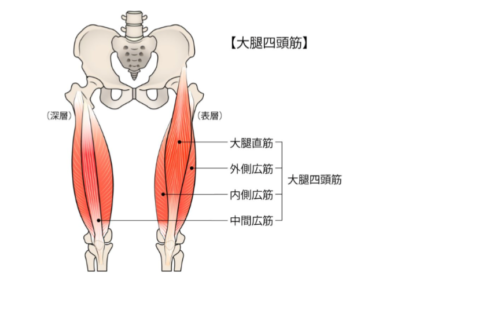 大腿四頭筋とは太ももの前側にある筋肉群のことで、大腿直筋・外側広筋・中間広筋・内側広筋の4つの筋肉で構成されています。主に膝を伸ばす動きで強力に作用し、歩いていたり走っている状態から止まるときや、立ち上がったり座ったりする動作の際に働きます。また、立っている状態での身体の安定性にも関わっています。