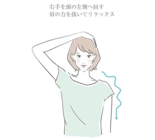 肩の力を抜いてリラックスし、右手を頭の左側に回す