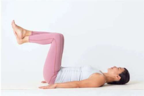 2.おへそを背骨に近づけて下腹部に力を入れ、息を吸いながら両脚を床から持ち上げる。膝は90度に曲げ、つま先は天井に向ける。
