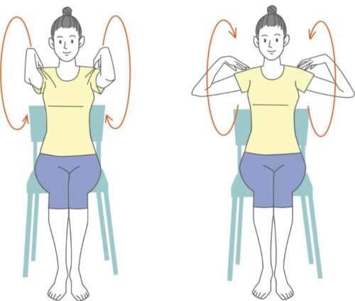 1. 肩に指を乗せ、肘で大きく円を描く(前10回/後ろ10回)