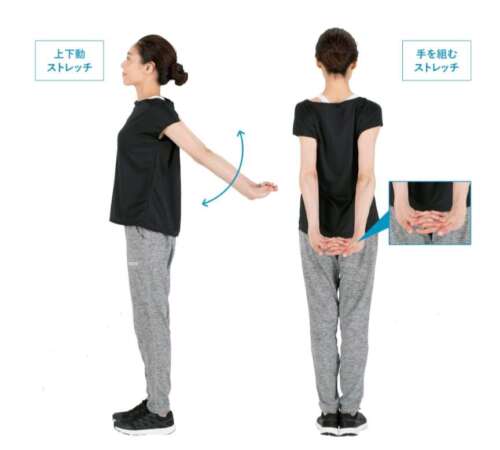2. 両手を後ろで組んで、胸を開くように引く(10秒キープ×3セット)
