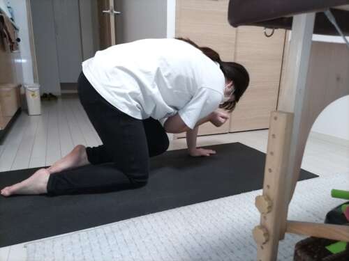 ①四つ這いになり、右手を浮かせ前に、左脚を浮かせ後ろへまっすぐ伸ばします。