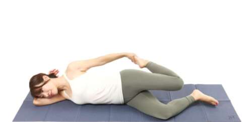 ★上の脚の膝をお腹から遠ざけるように後ろに引きます。