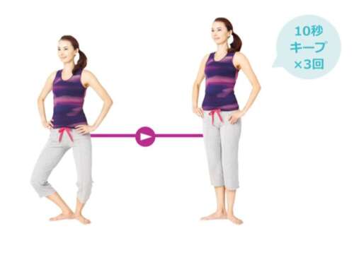 腰に手を当て、かかとをつけてつま先をできるだけ開く